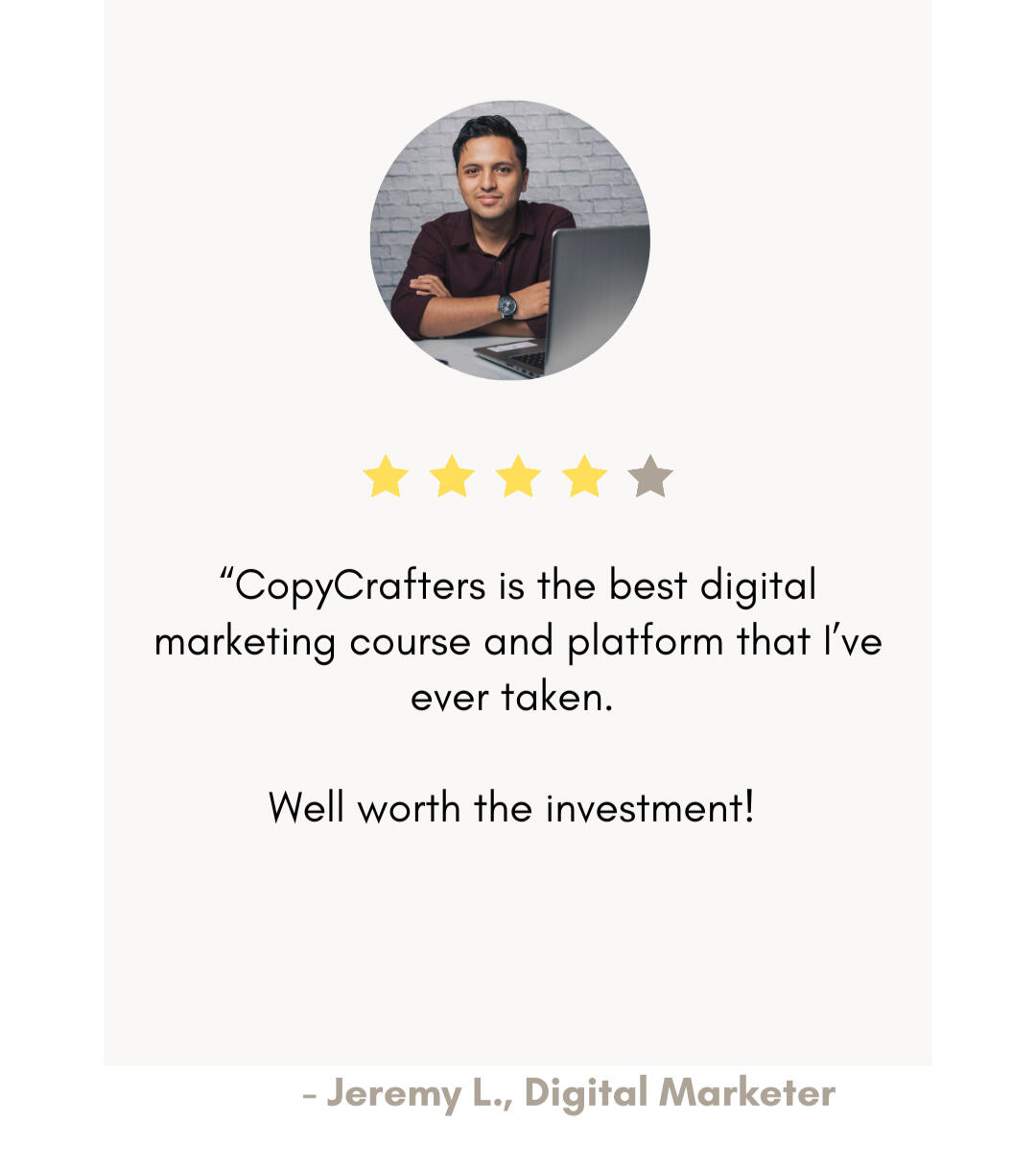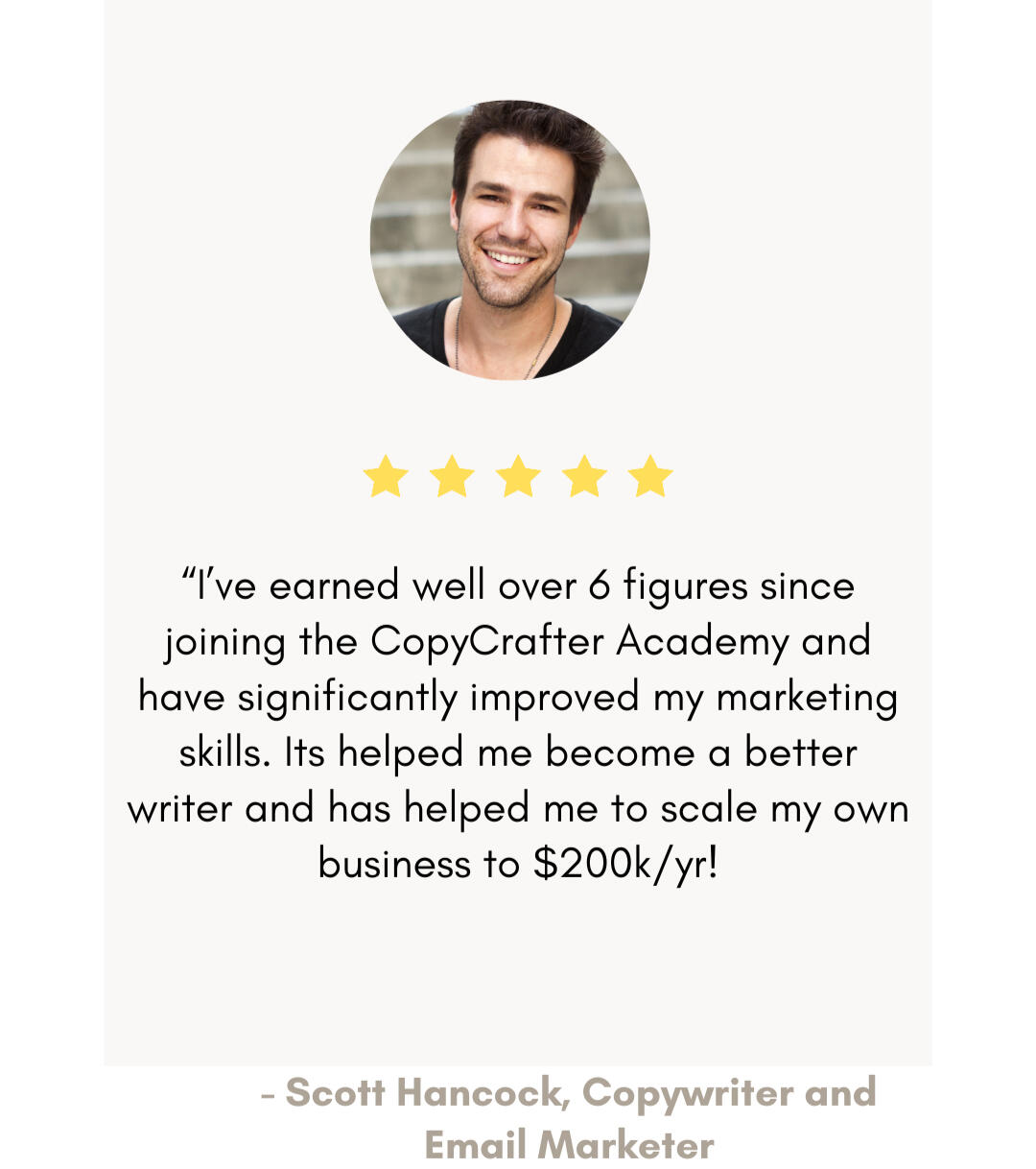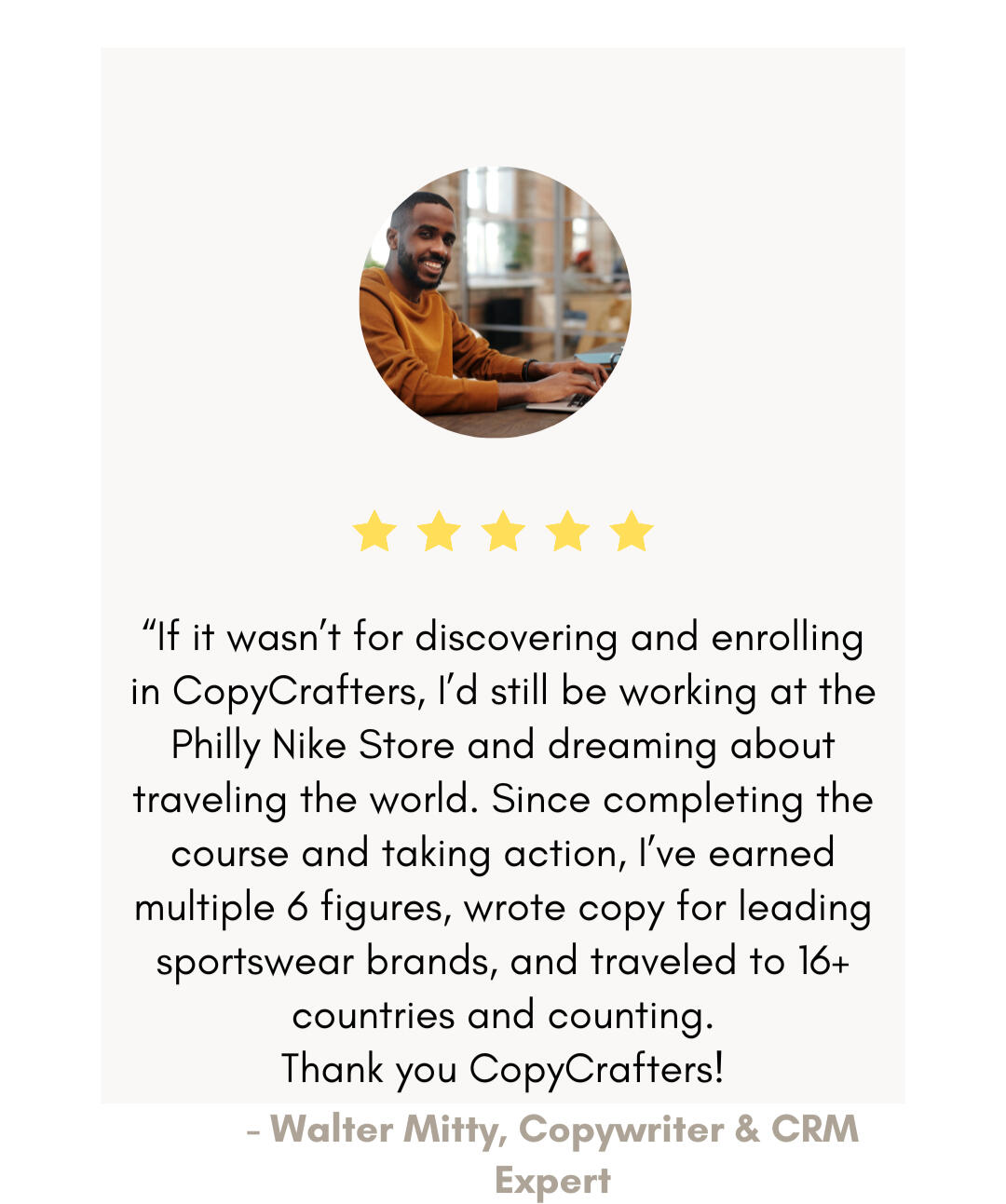 His charisma grabbed my attention but it was his 3 story villa in Phoenix, Arizona, overlooking the blistering Sonoran desert that made me watch his video to the end.Here was a 36 year old white guy with blonde dreadlocks in a turquoise shirt, who claimed to make $1,000,000+/ year from an online copywriting business that he operated from his laptop, by writing only working 5 hours a day ......C'mon, I wasn't born yesterday buddy.I knew that this guy had to be high… lying…or both.There was NO way someone earned millions of dollars just from typing words their laptop all day ...And to cap it all off ... in all of his videos… he wore his PJ pants and crocs.What was his hustle?I dug in and did some research on the guy and lo and behold he turned out to be legit.More than legit; he was a bonafide self made millionaire & online entrepreneur with 10+ years digital marketing and copywriting. He hustled!He wrote sales copy for real estate mogul's Ant Carzone's Enlightened Leadership Summit which generated over 540,000 attendees and $1.8M in rev for Carzone's company.Blair had major skin in the online biz game.I decided right then and there that I HAD to learn what he knew... or die trying.I found his personal email and reached out to him day after day.At first, he didn't return any of my emails or cold dms.Until one fateful day, he answered back to me via email and asked me 1 question:“What can you offer me?”I had been preparing and was ready; I replied to him with a link to my copywriting portfolio I’d been working on since discovering his YouTube.I had copied all of his tips, tricks and frameworks on writing effective copy and had written a sales email for his brand.Surprisingly, he asked to hop on a call with me.I call it the “Life - Changing” call, because it did just that, it changed my life.I quit my job that very same day and told my boss where to put it. He did'nt like it very much but I was free!Blair’s been my mentor, friend and coach ever since.I've since gone on to generate 8+ figures for various digital brands, social media influencers and e-commerce brands that you know and adore.A few friends and former co-workers wanted to learn my tricks and methods.They wanted to know what I did and was doing to earn $11K per month from writing words on my laptop, a few hours a day.....They wanted to duplicate my success.So I took them on and taught them everything that I knew.After 1 year of learning my copywriting formula, each of them were earning enough money to quit their 9-5s and make a healthy 6+ figure living from copywriting.Seeing my friends and family happy and financially free, made me happy. I realized that if I could teach 5 of my loved ones these keys to financial freedom, that I could teach anyone.It was no longer about the money, but about teaching others to take back control of their financial destinies and living life on their own terms.So over the past year, I’ve been teaching EVERYTHING that I know about entrepreneurship and copywriting to hundreds of dedicated and hungry students.I've compiled EVERYTHING that I know into a copywriting Masterclass for serious students who want to leave the 9-5 rat race for good and join the millionaire fastlane ...I call it the CopyCrafters Academy.“What is the CopyCrafters Academy?”The CopyCrafters Academy is a copywriting and digital marketing course, jam packed with everything that a beginner copywriter and digital entrepreneur would ever need to begin their career.No need to read countless copywriting or marketing books, watch countless videos from so-called "gurus" and "experts" and spinning your wheels looking for the perfect copywriting course.In this Comprehensive Course, you get:1) Unlimited 24/7 Access to 12+ Seasoned Copywriting and Marketing Vets (8+ Years Experience each), Dedicated to Teaching You How to Become an Expert Copywriter and Digital Marketer2) 9 Simple & Easy-to-Follow Modules to Accelerate your Copywriting Skills and to Take your Digital Marketing Knowledge to the Next Level3) Weekly Accountability Coaching Calls to Answer Your Burning Questions and 1-on-1 Mentoring with me to Help you Keep Your Eye on the Ball4) A Supportive Community of 985+ Location Independent Online Entrepreneurs, Digital Nomads, Bloggers, SEO Experts, Copywriters, and CRM Wizards5) The Insider Secret Blueprint That Took me From $329 in my Checking Account to Earning $100k+ from my Laptop in less than 1 Yr6) 2 Bonus Courses (that I promised I would'nt give away) and A Forbidden Marketing Trick that Causes Prospects to Open Their Wallets Quicker than Kids in a Candy store985+ Happy Financially Free students are raving about CopyCrafters Academy. Here are some of our highest earning students: